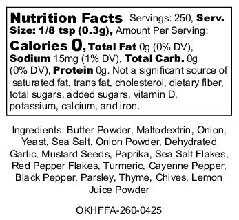 A mix of garlic, paprika, toasted onion, herbs, paprika, cayenne, black pepper, mustard, and lemon. Use as a dry rub, marinade, or seasoning for fries, burgers, BBQ, beef, poultry, pork, seafood, vegetables, or popcorn. This versatile blend adds depth and a burst of flavor to your favorite dishes, delivering a savory kick whether you’re grilling, roasting, or simply sprinkling on snacks for an extra zesty touch.