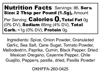 An authentic taco seasoning inspired by traditional Mexican flavors: a rich blend of three chiles (ancho, guajillo, and pasilla) for smoky, earthy depth, Mexican oregano for herbal brightness, and a balanced mix of spices like cumin, garlic, and coriander. Perfect for seasoning meats, beans, or veggies with genuine Mexican flair.